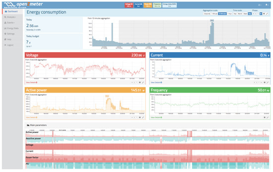 The parameters are displayed in real time and are presented using an intuitive dashboard, where the data are refreshed dynamically using cutting-edge web technologies such as HTML5, CSS3, and Javascript. Five blocks are plotted for active energy consumption, RMS voltage, RMS current, active power, and grid frequency. Each plot can be maximized for better inspection. All blocks are plotted using a 3 s aggregation interval over the previous 2 h to obtain fine-grained resolution. In addition, the energy block has a more advanced selector in order to choose other resolutions or aggregations. All blocks except for the energy block are synchronized to display information for the same time frame. The rest of the web interface is divided into six sections: voltage, current, power, frequency, voltage events, and energy stats.