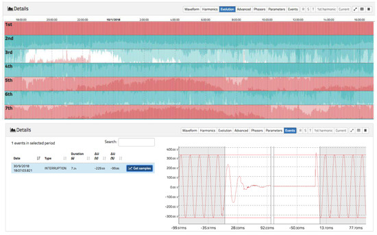 Figure 10 details the view of voltage events. A shows the different events that the system can handle: dip, swell, rapid voltage change (RVC), and interruption. In this case, an interruption of 7.24 s is shown. On the right, it is possible to visualize the precise moment before and after the interruption.