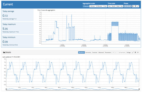 The current analysis view follows the same approach as the voltage view. Here, a main chart showing the evolution of the RMS current for different aggregation levels and time spans in real time is presented. The data can be downloaded in CSV format. It is also possible to visualize the waveform, harmonics evolution, and advanced parameters such as Total Harmonic Distortion for current (THDi) and power factor. Figure 11 and Figure 12 show the relevant information of the current measurement.