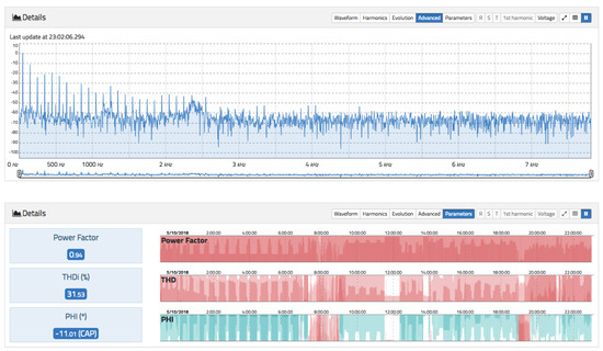 Figure 9 shows the harmonic spectral content for the signal in Figure 8. It can be seen that the odd harmonics (typical of commercial supplies) have a higher value than the even harmonics. In particular, the 3rd, 5th, and 7th harmonics have the highest value. In the lower part of Figure 9, the evolution of the values of the power factor, Total Harmonic Distortion for voltage (THDv), and phase angle between the voltage and fundamental current for the last 24 h is shown. Darker colours indicate higher values. For the phase-angle chart, positive (red) and negative (blue) values are shown, so it is possible to visualize the inductive or capacitive nature of the load. Finally, on the right of Figure 9, there is a phasor chart of current and voltage, where the capacitive nature of the load is appreciated since the current overtakes the voltage. The values of this phasor chart are obtained by applying an FFT and plotting the module and phase angle between the fundamental components of the voltage and current.