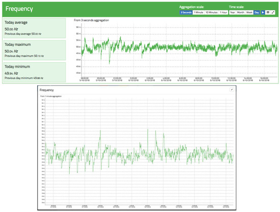 Figure 14 shows an example of frequency tracking for a full day and an aggregation of 3 s. It can be seen that the average is exactly 50 Hz, oscillating around it with maximums and minimums of a few millihertz. Also noteworthy are the large oscillations at o’clock owing to the entry and exit of generator groups according to the Spanish electrical system’s time schedule, where some groups are disconnected/connected to adjust the generation to the demand. This causes accelerations/decelerations in the frequency according to the period of the day.