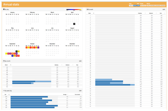 An active and reactive energy measurement is carried out by adding the power measurement over time. Since the power was already analysed in previous sections, it is easy to obtain the accumulated values because this simply requires multiplication of the value of the power by time and determination of the consumption or generation of energy. For a better analysis, two visualizations were implemented, as shown in Figure 16 and Figure 17. Figure 16 shows a visualization more oriented to tables, where it is possible to analyse the energy habits depending on the year, month, week of the year, or day of the week. It is possible to distinguish between day and night periods. This is of great interest because many countries apply different pricing policies depending on whether energy is consumed during the day (where there is much more demand and the system is overloaded) than at night (where demand is much lower and energy prices are also lower).