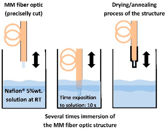 The fiber sensor probe is made with a multi-mode (MM) gradient index (GI) fibers. Dip (or immersion) coating is a relatively simple technique for coating glass and plastic substrates with uniform thin films from liquid phase. This work employs dip coating to deposit Nafion® layer onto end of the fiber optic substrate as uniform sensing coating. The Nafion®-based sensing structures was fabricated by the following approach. Nafion® perfluorinated ion-exchange resin solution (5 wt.% in mixture of lower aliphatic alcohols and water, contains 45% water, cat. 510211) was purchased from Sigma Aldrich (Poznań, Poland) and used without any further purification. It was immobilized directly onto the end of precisely cleaved MM fiber optic (62.5/125 µm) by dip coating at room temperature for 10 s–Figure 2. After the coating process, the coated fiber optics were then dried for 120 min. at 40 °C, and cured for 15 min. at temperature of 110 °C. After solvent evaporation, the interfacial Nafion® thin film is about several hundred nanometers thick. After deposition of the first layer of about one hundred nanometers thickness, the fiber optic substrate becomes more adhesive and the next layers will be deposited at the immersion process are thicker than first. Subsequently, a Nafion®-based sensing structure will be built up by successive depositions of single layers. As a result of the single process deposition a Nafion® layer of a thickness of approximately 260 nm (±20 nm) was obtained. In order to obtain thicker layers, the deposition process must be repeated several times. The accuracy of the layer thickness of the single process deposition is about 10%. In the present study sensing structures fabricated with two layers of Nafion® have been used.