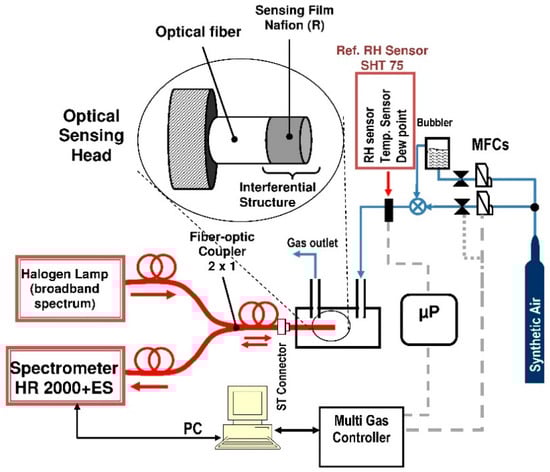 For the sensor response examination, the sensing structure set in a PTFE/Viton holder was placed in a stainless steel flow chamber. Humid air was prepared by allowing passage of a dry air (synthetic air 79% N2, 21% O2; SIAD Poland, Ruda Śląska, Poland) from a cylinder through a deionized (DI) water bubbler. Humidity of the test gas prepared was balanced by mixing the humid air and dry (RH = 5.5%) air at a prescribed ratio of the flow rate (total flow rate: 500 sccm) and was monitored with a commercial humidity sensor (SHT75; Sensirion AG, Staefa, Switzerland). Multi-gas controller based on Bronkhorst mass flow controller-mixed gases with a precision exceeding 0.1%. All elements of the pneumatic circuit are made of stainless steel 316 L and PTFE. The idea of the measurements was to obtain the spectral reflection characteristics when exposed to a mixture of synthetic air with a varying volumetric content of water vapor.