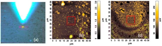 Surface analysis of the Nafion®-based fiber optic sensing microstructure; (a) optical micrograph with AFM tip position and laser (633 nm) spot (b) 50 µm × 50 µm AFM height topography image, (c) 50 µm × 50 µm CLSM image.