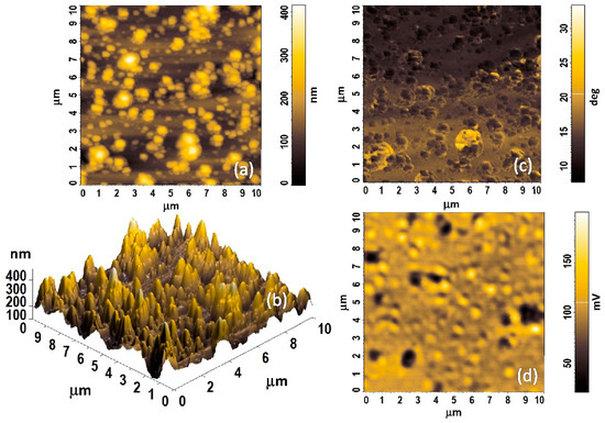 Cluster-like structures with a diameter of about 0.5–1 µm are clearly visible, particularly in the AFM phase images. These structures generally correspond to features in the topography image and CSLM image. The phase imaging is an AFM semi-contact technique. This method allows for imaging the distribution of changes in mechanical properties of the sample. Therefore in heterogeneous samples, for areas with different mechanical properties, can be observed as different phase angles. In addition, phase imaging improves the contrast and allows one to extract topography details. Nafion® has ordered structures in which the hydrophilic groups are within a hydrophobic matrix composed of the fluorocarbon backbone of the polymer. The density contrast between the ionic clusters and the matrix gives rise to AFM phase contrast imaging [28,29]. The phase contrast between the hydrophilic sulphonic acid groups and the hydrophobic regions is strongly visible in Figure 6c and it should increase with humidity due to sorption of water into the hydrophilic regions [29].