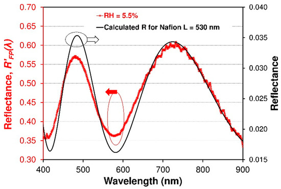 A comparison between measured normalized reflectance spectra (RFP’(λ)—red line) of the FPI sensor and a simulation (black solid line) of reflectance spectra with Nafion® of 726 μm. Fringe patterns correlating to effective cavity length to nL, where L = 530 nm, n = 1.37 RIU.