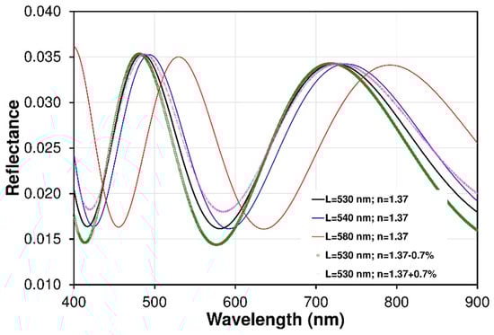 Nafion® copolymers belong to the general class of segmented comb copolymer materials and generally consist of a hydrophobic fluorocarbon backbone with hydrophilic sulfonic acid side-chains. Most early studies [27,28,29,30,31] as well as this research have shown the heterogeneity of Nafion® films in both their morphology and optical properties due to the complex roles of chemical structure and intramolecular interactions. Nafion® exhibits strong morphologically heterogeneous, possessing domains with varying degrees of order and non-uniform grain boundaries, particularly in bulk films and membranes [27,28,29]. As the Nafion® thickness decreases, changes in the behaviour of the material (e.g., changes in swelling process) can be expected due to a disordering of the film hydrophilic/hydrophobic structure on the molecular and nanometer scale. Given these facts, optical and different information from bulk films is then an average of this large heterogeneity, and may be different than for size-limited structures. Nevertheless, despite this heterogeneity, the reflected optical signal is averaged and the interference signal is clearly visible. Figure 7 shows fringe patterns correlating to cavity length (L) about of 530 nm (thickness of the Nafion® thin film). This covered optical fiber is clearly suitable for Fabry-Perot construction as it demonstrates Fabry-Perot fringes. The theoretical spectral reflectance of the interferometric structures was modelled by means of software developed in the LabVlEW™ environment. This model is based on Fresnel’s theory and the matrix formalism of the propagation of electromagnetic waves thorough layered structures. The investigations concerned the Vis-NIR range of spectra (350–900 nm) in the range of ±25 degrees the angle of non-polarized light incidence on the structure. The model does not take into account the intermodal interferences in the MM fiber. The results of numerical simulation presented in Figure 7 (black solid line) illustrate the excitation of interference phenomena in the structure as a function of the wavelength. Figure 8 shows a comparison of the calculated interferograms for the Nafion® cavity with different path length. The results show fringe shift effects and its contrast change due to cavity length and refractive index variation. This modeling allows me to assess the effect of parameters on the final fringe pattern of the FPI sensor.