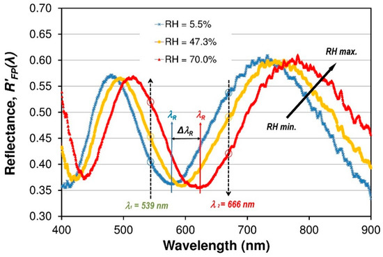 Normalized spectral reflectance signals (RFP’(λ)) of the FPI sensor at three operating RH of the air at RT (22 °C). Device presents a non-linear tuning fringe pattern for RH variation between 5.5% and 70%.