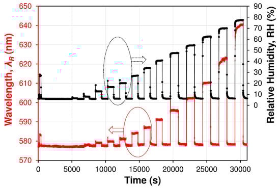 To investigate the dynamic performance and sensitivity of the FP sensor, the RH in the gas flow chamber is set to switch between RHmin 5.5% and several humidity levels up to RHmax 80% at RT. The RH level was monitored with a commercial humidity electronic sensor in the same chamber. Some cycles of the RH switching are measured and shown in Figure 10. The wavelength shift of the resonant dark fringe (the fringe is chosen arbitrarily) in the wavelength range of 530–680 nm was traced with the increase and decrease in RH. The measured wavelength redshift with the RH variation is shown in Figure 10. It can be seen that the chosen dark fringe, which is caused by destructive interference of light beam in cavity, will redshift from 576 nm at 5.5% RH to 640 nm at 78% RH. It can be observed in Figure 11 that the fiber optic sensor exhibits a very non-linear performance and sensor has a short response and a very good reversibility without any hysteresis.