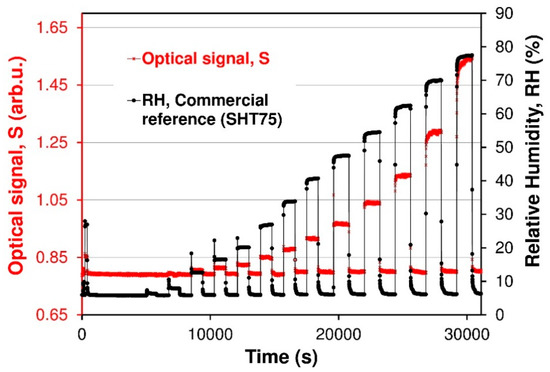 As a result of investigations of dynamic behavior of the sensor, response and recovery times were calculated. The data were collected in Table 1. The response and recovery time of the FPI sensor has been found to depend on RH level. It is evident from Figure 13 that FPI sensors possesses similar responses and recovery time values better than 5 s for RH < 50%, whereas the response time becomes longer than the regeneration time for higher humidity RH > 50%. Figure 15a,b is a zoom-in of a RH 27% and 78% cycle, respectively. From Figure 15a, it can be seen that the optical signal S increases by 0.06 when the RH is varied from 5.5% to 27% and comes back to the original S for RH 5.5%. From Figure 15a, it can be seen that the response time for the FPI sensor is less than 5 s and the recovery time is also better than 5 s. Response and recovery times of sensors affect the RH increasing and RH decreasing processes with RH ranging from 5.5% to 78% (Figure 15b). The sensor response time (humidification from 6% to 78% RH) was about 80 s, and the recovery time (desiccation from 78% to 6% RH) was about 12 s. The recovery times for higher humidity levels were better than recovery times of reference capacitive sensor. The response time is a little slower than that of the about 16 s (RH 78%, SHT 75) is because the unique (more complex) water molecules sorption processes by Nafion® polymer films.