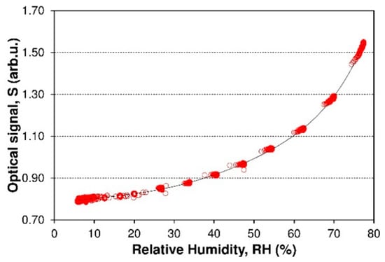 Water vapor is a substance encountered in our daily lives and in many areas of industry. Thus, humidity measurements are an extremely important in the chemical processing, electronics, food, pharmaceutical, automotive, agriculture, and many other industries [1,2,3,4,5]. The production and storage of different materials can also be also improved with better control of humidity [1,2,3]. Depending on the operating conditions moisture levels can be measured by various types of sensors based on a variety of water vapor sensing materials and sensor technologies. Chen and Lu [1], and Rittersma [2] have presented broad reviews of humidity sensors for a wide variety of applications. The major scientific and industrial application concerns electronic humidity sensors with electric output [2], but like other electronic sensors, electronic RH sensors are susceptible to electromagnetic interference. Compared with their electronic counterparts, fiber optic sensors have a number of advantages. Yeo et al. [4] and Ascorbe et al. [5] have presented reviews of various fiber optics-based humidity sensing techniques. Particular attention should be given to the design of fiber humidity sensors based on etched polymer fiber optics (POFs) [6,7]. Rajan et al. [6] demonstrated that FBGs produced in etched polymer fiber optics (POFs) present enhanced humidity sensitivity compared to pristine fibers. Etched POF gratings were fabricated by solvent etching after the grating inscription, which resulted in very short response times for humidity sensors based on POF. Another solution is a sensor based on the variations in the etched stress-POF material’s properties due to ambient humidity variations [7]. The stress on the etched fibers leads to output power variations due to the effective stress-optic effect. The water vapor intake into the etched core of PMMA stress-optic polymer fibers causes fiber refractive index changes [7]. These sensors have short response times and have the potential for low cost fabrication and applications. However, the remaining diameter is so thin that such etched POFs are not convenient to handle and are very fragile.
