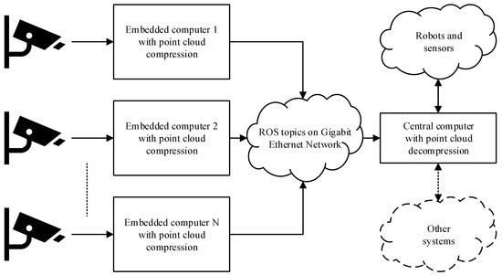 One feature of the 3D sensors is the generation of a potentially large amount of data, requiring a high bandwidth between the sensor and the computer processing the data. For example, the Microsoft Kinect for Xbox One (Kinect V2) sensor (Microsoft Corporation, Redmond, WA, USA) can generate data of several Gbit/s on a USB3 connection. With a dedicated PCI card, it is possible to use a few such sensors on a single computer; however, scaling the solution up to many more sensors is difficult with a centralized solution. A first step to ensure scalability is to lower the bandwidth requirement using point cloud compression. The following subsection will describe previous methods for compressing point cloud data and the main contributions of this paper will be outlined in Section 1.2.