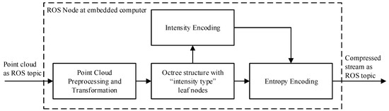 In our work, the point detail encoding was replaced by the generated intensity value stored in a single byte with a range 0–255. The range is not further limited, but, in contrast to the original method, our method guarantees that there will only be one such number for each voxel. Depending on the octree resolution and the sensor resolution, there could possibly be a large number of points encapsulated by each voxel. The original method requires that, for each point, the point details must be encoded, but when using an intensity value, only a single byte is needed. Both the serialized octree and the intensity values are finally passed to the range encoder, which results in a compressed byte stream that is published as an ROS topic.