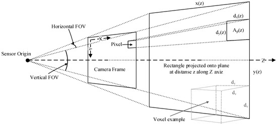 Let x and y be the side lengths of the rectangle that is generated by intersecting the FOV with a plane perpendicular to the Z-axis (the depth axis) of the sensor (see Figure 4). Using the FOV angles, the lengths at a given depth z can be calculated as