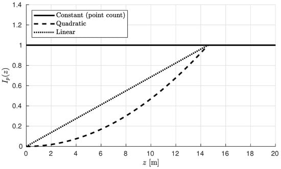 where c is constant for a given sensor type. It should be noted that c will be different depending on the sensor type and its parameters, i.e., the FOV and the resolution. Changing any of these values will impact the calculation of the point intensity value . A finer resolution (more pixels in the same FOV), will result in a lower , as more points will fit into a voxel. A larger FOV with the same resolution will have the opposite effect. In addition, note that is an approximation: The voxels have a fixed placement in the global coordinate system and, depending on the transformation between the sensor and the global coordinate system and the distance z, may not accurately describe the area of the voxel when projected onto the plane, since the voxel may be rotated or offset relative to the plane. However, since the calculation of the point intensity value is performed before the points are transformed, this approximation is not practically avoidable. The point intensity value for a given measurement point can now be defined as