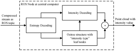 For each leaf node in the received octree, a point is generated from the voxel center coordinate and the intensity value of the voxel. The result is a new point cloud including coordinates with a precision equal to the octree resolution, similar to a voxel grid filter. Every leaf node of the decompressed octree thus results in an XYZI point in the new point cloud, including the voxel intensity value in the range 0–255 (see Figure 7).