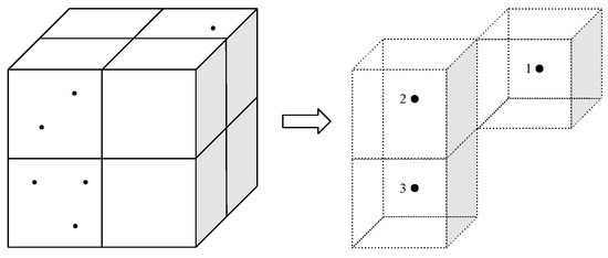 (Left) The points of the original point cloud inserted into an octree structure. The figure shows only a subset of the octree consisting of eight leaf nodes, where three of the voxels are occupied. (Right) After decompression, the reconstructed point cloud contains points at the center coordinate of the occupied voxels, in addition to the intensity value. In this example, the intensity value is generated by point counting. The dashed voxel cubes on the right-hand side are only shown for reference.
