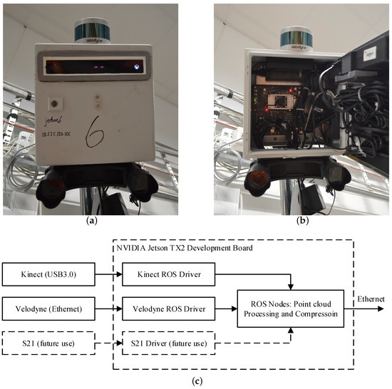 The ROS nodes for preprocessing and compression were deployed on six NVIDIA Jetson TX2 Development Boards, each connected to their own Kinect V2 depth sensor. one node is also connected to a Velodyne VLP-16 PUCK lidar and, for future use, a Carnegie Robotics Multisense S21 stereo camera (Carnegie Robotics LLC, Pittsburgh, PA, USA), as seen in Figure 9. The Jetson TX2 contains a Quad-core Arm A57 CPU (Arm Limited, Cambridge, UK), an NVIDIA Pascal GPGPU and 8 GB LPDDR4 memory. The ROS node for decompression and denoising was deployed on the central computer, which was equipped with an Intel Core i5-2500 CPU (Intel Corporation, Santa Clara, CA, USA) and 8 GB of system memory.