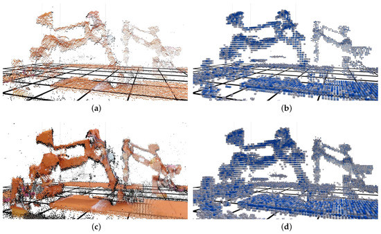 Figure 10 shows a visual comparison between uncompressed and compressed point clouds. Figure 10a,c show the cropped point cloud with RGB color, where Figure 10c is accumulated over one second for better visibility. Figure 10b,d show the same region of interest after compression and decompression, using a 4 cm octree resolution. The decompressed clouds were filtered using the calculated intensity value, such that points with an intensity value lower than 2 were removed. To highlight the underlying octree structure, the points are displayed using cubes.