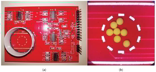 (a) overview of the printed circuit board (PCB) with circuitry and sensor (bottom left), and (b) zoom of the sensing element with some defects.