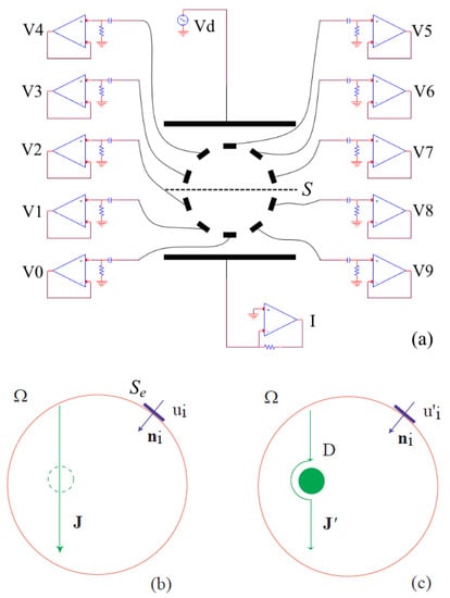 (a) Schematic of the board, where potentials of the sensing electrodes with are shown; moreover, the pair of outer current electrodes have applied voltage and current I. (b) Current conduction in domain without insulating domain. (c) Current conduction in , where D is the insulating domain.
