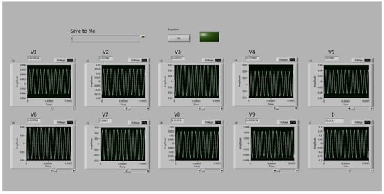 A 16 bits DAQ board is connected to the circuit (National Instruments NI-USB 6353); the DAQ has been set to acquire, at rate 1 MSa/s, a number of 3000 samples (corresponding to 300 periods of the driving voltage) of each differential voltage , where is the potential of each electrode surface and is the potential of the lower electrode, chosen as reference, Figure 2a. The current signal I flowing through the outer electrodes is acquired as a single ended trace referred to ground. A dedicated control panel, shown in Figure 3, developed in LabView, acquires the data of the driving current and of . During a measurement cycle, the DAQ reads the nine differential voltages () and the current signal (I). The measurement time for each channel is 3 ms, thus the acquisition time is 30 ms. After acquisition, the control panel calculates the AC-coupled RMS value of each quantity and saves the results into a text file. The volume of the defects is then computed with a Matlab script which calculates the quantity as described in the next subsection.