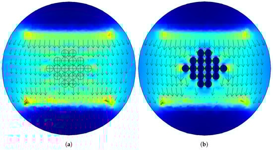 Figure 4a shows the simulated current density when all the spheres have the same conductivity of water, while Figure 4b shows the current density distribution when all the spheres have conductivity of glass; it is evident in Figure 4b that the current density avoids the glass insulating spheres, while no discontinuity is manifested in Figure 4a.
