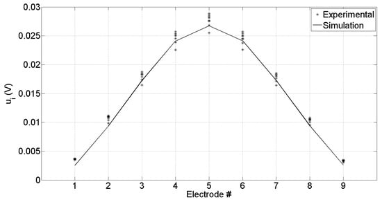 Differential voltage at th electrode ; line represents the numerical simulation, markers represent experimental results on 10 different measurements without defects in the sensor.