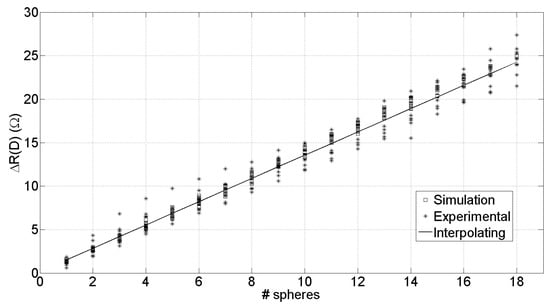 Figure 7 shows the plots of linearity error for simulations (top graph) and experimental data (bottom graph); error bars represent the standard deviation of the sample means . The results are expressed in terms of number of microspheres, and it is possible to see that both simulations and experimental results agree, showing 0.2 spheres non-linearity. This value corresponds, knowing that each sphere is 1.77 × 10−9 m3, to a non-linearity of 3.53 × 10−10 m3 (i.e., 1% of the measured volume). The agreement of non-linearity between simulated and experimental data is due to the approximation in (5); the accuracy of this approximation depends on the number of electrodes in the polygonal investigation area. With 10 voltage electrodes the non-linearity is in the order of 1%, this could be improved with a higher number of electrodes; obviously, increasing the number of electrodes means introducing more electronic components, a DAQ with more channels and longer acquisition time, thus invalidating the low-cost profile of the proposed solution.