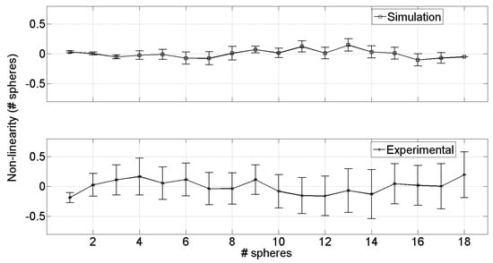 Evaluation of the non-linearity on the measurement expressed in terms of number of spheres (one sphere is 1.77 × 10−9 m3). Top graph represents the simulations, bottom graph represents experimental results. Error bars are the uncertainty expressed as standard deviation of the sample means.