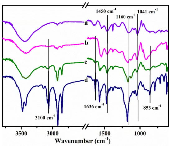 The IL-PPy composites were prepared and the obtained samples were characterized by FTIR. Figure 1 depicts the FTIR spectra of different samples prepared in water, [C2mim]Br, [C6mim]Br and [C12mim]Br aqueous solutions, respectively (curves a-d). It can be seen that the four samples all show obvious infrared characteristic PPy peaks located at 1537 cm−1, 1450 cm−1 and 1160 cm−1 corresponding to the C-C, C=C and C-N stretching vibrations of the pyrrole ring, respectively [33]. The bands at 906 cm−1 and 1041 cm−1 are assigned to the C-C out-of-plane vibration and C-H in-plane vibration of PPy, respectively [34]. Compared with curve a (the sample prepared in water), no significant changes can be observed in curve b (the sample prepared in [C2mim]Br solution), which indicates that the components of the two samples are almost the same. However, for the samples prepared in [C6mim]Br (curve c) and [C12mim]Br (curve d) solutions, the infrared absorption peaks of the methyl imidazole cation at 3100 cm−1, 1636 cm−1, 1445 cm−1 appear, as shown in curve c and curve d. The obvious absorption peaks at 853 cm−1, 752 cm−1 and 651 cm−1 can be attributed to the C-H out of plane bending vibrations of the imidazole ring [35], which reconfirms the existence of a methyl imidazole ring in the samples obtained in [C6mim]Br and [C12mim]Br solution, respectively. Upon further observation can be seen that the characteristic peaks of PPy at 1537, 1450, 1160, and 1041 cm−1 are all upshifted about 10–20 cm−1 to higher wavenumbers in curve c and curve d. This phenomenon should result from the π–π interaction and hydrogen bond between the imidazole rings of the ILs and the PPy backbone [36]. The above results indicate that ILs with longer alkyl chains ([C6mim]Br and [C12mim]Br) can take part in the polymerization of pyrrole and further form the hybrid IL-PPy composites by hydrophobic interaction, π–π interaction and hydrogen bonds between pyrrole and the ILs. Whereas only the pure PPy can be detected for the sample prepared in the solution containing an IL with a short chain ([C2mim]Br). Apparently, the hydrophobic interaction between pyrrole and ILs prevails.