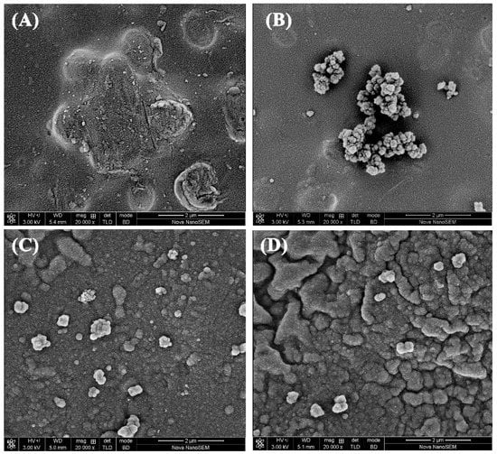 SEM images of species prepared by pyrrole polymerization in (A) water, (B) [C2mim]Br, (C) [C6mim]Br and (D) [C12mim]Br aqueous solutions.