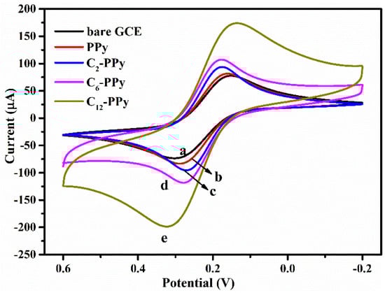 In order to investigate the effect of the alkyl chain length of ILs on the electrochemical performance of IL-PPy films, some electrochemical measurements were carried out on GCEs modified by IL-PPy (IL-PPy/GCE). Figure 3 shows the cyclic voltammograms (CVs) of different electrodes in [Fe(CN)6]3−/4− solution. Obviously, both the cathodic and the anodic peak currents of the modified GCEs increase to a different degree compared with that of bare GCE. As we know, PPy is particularly gifted at conduction, however, the peak current of GCE only increased slightly after being modified by PPy synthesized in water (curve b). The unexpected result may be attributed to the weak adhesion between simple PPy film and the electrode, which makes it difficult to firmly immobilize the PPy film on the glossy surface of the GCE. The introduction of ILs improves the peak current of the electrode to a certain degree (curve c-e), which should be due to the tighter immobilization of the IL-PPy composites on the GCE by hydrophobic interactions between the IL-PPy and the GCE. Certainly, the co-effect of the excellent conductivity of PPy and the better electrochemical activity of ILs also promotes the conductivity of the IL-PPy composites. According to the increase of the peak current, the conductivity of IL-PPy composites can be ranked in the following order: C2-PPy < C6-PPy < C12-PPy, which coincides with the results of BET surface area for the different materials (presented in Figure S2). Reasonably, C12-PPy composites show the highest conductivity among the studied IL-PPy composites due to their larger surface area and firmer immobilization on the GCE.