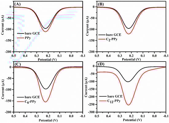 Comparison of DPV response of bare GCE and modified GCE (A) PPy/GCE; (B) C2-PPy/GCE; (C) C6-PPy/GCE and (D) C12-PPy/GCE in 0.01 M PBS containing 5 mM Fe[(CN)6]3−/4− and 0.1 M KCl (pH 7.0).