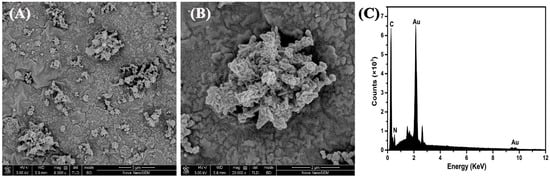 (A) SEM image of C12-PPy-Au composites and (B) the corresponding magnified SEM image, (C) EDS of C12-PPy-Au composites.