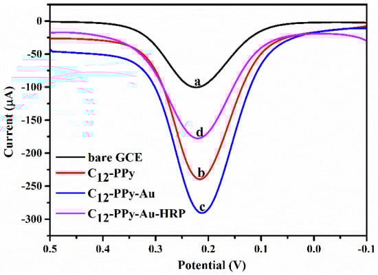 DPV current responses of stepwise modified GCE (a) bare GCE, (b) C12-PPy/GCE, (c) C12-PPy-Au/GCE and (d) C12-PPy-Au-HRP/GCE in 0.01 M PBS containing 5 mM Fe[(CN)6]3−/4− and 0.1 M KCl (pH 7.0).
