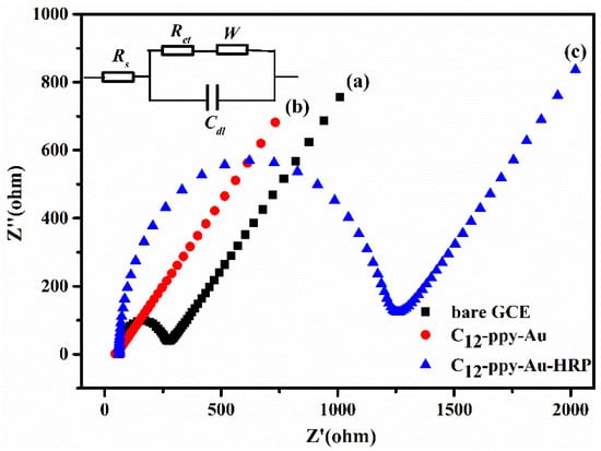 EIS responses of stepwise modified GCE (a) bare GCE, (b) C12-PPy/GCE, (c) C12-PPy-Au-HRP/GCE in 0.01 M PBS containing 5 mM Fe[(CN)6]3−/4− and 0.1 M KCl (pH 7.0).