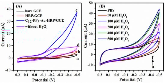 (A) Cyclic voltammograms of bare GCE (a), HRP/GCE (b), C12-PPy-Au-HRP/GCE in the presence of 100 μM H2O2 (c) and absence of H2O2 (d) in 0.01 M PBS (pH = 7.0). (B) Cyclic voltammograms of C12-PPy-Au-HRP/GCE in 0.1 M PBS (pH = 7.0) containing different concentrations of H2O2, (a–f): 0–500 μM H2O2. Scan rate: 50 mV·s−1.
