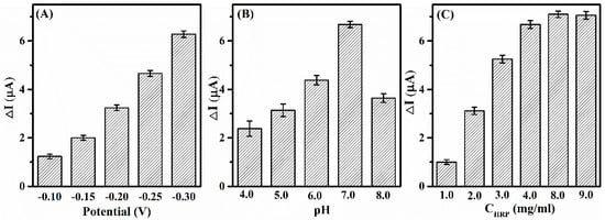 The operating potential, pH value and the amount of HRP immobilized on the electrode are influential factors of the performance of enzyme-based biosensors. Therefore, the detection conditions were further optimized to obtain a C12-PPy-Au-HRP/GCE sensor with excellent performance. The optimal operating potential corresponding to the maximum response current to H2O2 is optimized firstly. The potential optimization range is assigned from −0.1 V to −0.5 V according to the obtained response current in the CV curves (Figure 8B). Chronoamperometry is adopted to measure the response current of the PPy-Au-HRP/GCE biosensors in PBS containing 100 μM H2O2 at different constant potentials. The optimization result is shown in Figure 9A, in which the response currents of the biosensor increase with the increase of the potential in the range from −0.1 V to −0.3 V. However, when the potential surpasses −0.3 V, the current baseline tends to become unstable and quivering, which may result from the decrease of stability of HRP on the electrode caused by the increase of the potential. Therefore, the optimal operating potential is assigned to −0.3 V at which the subsequent optimization was conducted.