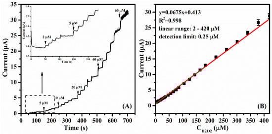 Under the optimum conditions, a typical current–time plot of a C12-PPy-Au-HRP/GCE biosensor upon the successive addition of H2O2 is shown in Figure 10A. As H2O2 of increased concentration (2–60 μM) is added into the stirring buffer solution, a stepwise increase of the current response is observed. Actually, a weaker current can be detected when the concentration of H2O2 is as low as 0.25 μM, but the current baseline is unstable. The current increases stably with the addition of aliquots of H2O2 (the inset in Figure 10A) until the concentration of H2O2 reaches 2 μM. In particular, the response currents increase sharply to a stable value within 1 s by each addition of H2O2. Such a fast response should be attributed to the cooperation of C12-PPy composite and Au particles on GCE. On the one hand, C12-PPy composites greatly increase the surface area of the electrode and facilitate the electron transfer between electrode and H2O2 due to their excellent conductivity. On the other hand, Au particles are favorable to the orientation of the HRP molecules on the electrode in the bioelectro-catalysis process, which make electron transfers occur easily [43,44].