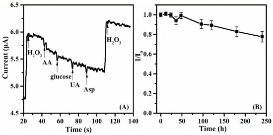 Selectivity and stability are two important factors of the performance of enzyme-based sensors. Firstly, the selectivity of C12-PPy-Au-HRP/GCE biosensor was investigated by sequentially adding several interferent molecules, including 1 mM ascorbic acid (AA), 1 mM glucose, 1mM uric acid (UA) and 1 mM aspartic acid (Asp) into the PBS containing 100 μM H2O2. As shown in Figure 11A the C12-PPy-Au-HRP/GCE biosensor exhibits negligible signals towards interferent molecules at concentrations of 10 times higher than that of H2O2, which demonstrates the proposed biosensor has excellent selectivity towards H2O2. Additionally, the stability of C12-PPy-Au-HRP/GCE biosensor was investigated by constantly measuring the amperometric response in PBS containing 100 μM H2O2 for 10 days (Figure 11B). The biosensor was stored in PBS (pH 7.0) at 4 oC when not used. After 10 days of storage, the current response toward H2O2 of the biosensor still remained at 77.6% of its initial value, which is indicative of the firm immobilization of HRP on C12-PPy-Au composite matrix that provides a biocompatible microenvironment for preventing enzyme inactivation.