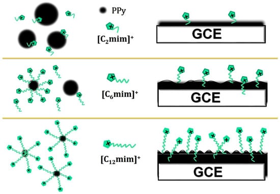 Sensitive and selective detection of hydrogen peroxide (H2O2) is of significance in the food industry, clinical diagnosis, environmental monitoring and biological metabolism studies [1,2]. Among the various H2O2 detection techniques, electrochemical sensors have been proved to be a promising method due to their simplicity, efficiency and high sensitivity [3]. Particularly, enzyme-based electrochemical biosensors arouse considerable interest in the sensing area because of their high catalytic activity, specificity and biocompatibility [4]. Horseradish peroxidase (HRP) is the most commonly used enzyme for fabricating H2O2 biosensors [5], however, one of its drawbacks is that the direct electron transfer of HRP on a bare electrode is shielded by the protein shells surrounding the redox center of HRP, the another is its unstable bioactivity and difficult reutilization of the native enzyme [6,7]. Enzymatic immobilization on nanoparticles or nanomaterials is expected to solve these problems. Therefore, the construction of immobilized enzyme layers that can accelerate the electron transfer as well as retain their specific bioactivity is highly desired [8]. So far, a large number of nanomaterials have been employed as substrate materials to immobilize enzymes for the construction of electrochemical enzyme sensors, such as metal nanoparticles [9], carbon nanomaterials [10], graphene [11] and conducting polymers [12]. Among these substrate materials, conducting polymers have intrinsic superiority in the electrochemical field owing to their good conductivity, easy modification and biocompatibility [13]. As one of the most promising conducting polymers, polypyrrole (PPy), consisting of five membered heterocyclic rings, is widely used for constructing biosensors on account of its prominent biocompatibility, redox properties, good environmental stability, and facile immobilization of biomolecules [14]. In order to make the most of the advantages of PPy in the fabrication of biosensors, microstructured/nanostructured PPys with high surface area and enhanced electrochemical capacitance have been successfully synthesized by chemical polymerization with the aid of additives such as organic solvents, surfactants and ionic liquids [15,16,17]. It is noteworthy that Shen et al. creatively employed 1-butyl-3-methylimidazolium tetrachloroferrate (Bmim[FeCl4]), an ionic liquid with a shorter alkyl chain, as the oxidant to synthesize a porous polypyrrole (PPy) film by facile interfacial polymerization, and it was found that the morphology of PPys changed from dense microspherical/nanospherical agglomerated structure to porous structures with the increasing concentration of IL, and the electrochemical performance tests showed that PPy with a porous structure displayed the highest specific capacitance and a good capacitive behavior [18]. Obviously, ILs show outstanding potential in the synthesis of PPy with good electrochemical performance that can be significantly affected by the properties of ILs such as concentration, charges and hydrophobicity. However, almost all of those studies focus on ILs with shorter chains and the understanding for the mechanism of ILs promoting the electrochemical performance of PPy is insufficient by far, making further systematically studies still necessary.