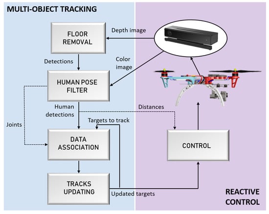The general architecture of the proposed system is presented by Figure 1, where the stages of the proposed Multi-Object Tracking algorithm (Section 4) are represented in the left column. This algorithm takes the information captured by the sensors placed in the UAV, and gives the location of the found individuals to the reactive control module, which is rendered in the column on the right.