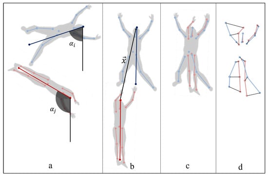 Pose dissimilarity measure : (a) track, , and human object, , poses; (b) track, , and human object, , rotated poses; (c) track rotated pose, , and human object rotated and translated pose, ; (d) joints distances.