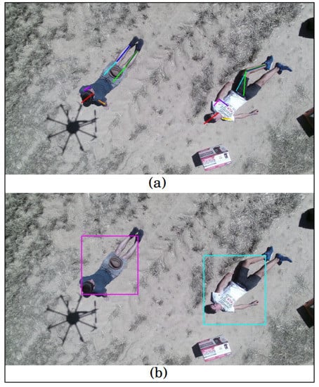 Moreover, the research has also been focused on enhancing human detection methods. The work presented in [] employs the position and articulation of the limbs to render each person. Dufek and Murphy presented a pose estimation algorithm of an Unmanned Surface Vehicle (USV) using visual information gathered by a UAV; in order to rescue drowning victims []. This system presented a helpful tool to the rescue team, however, it requires parameters tunning, which is not suitable for autonomous tasks.