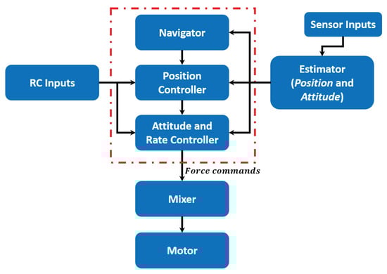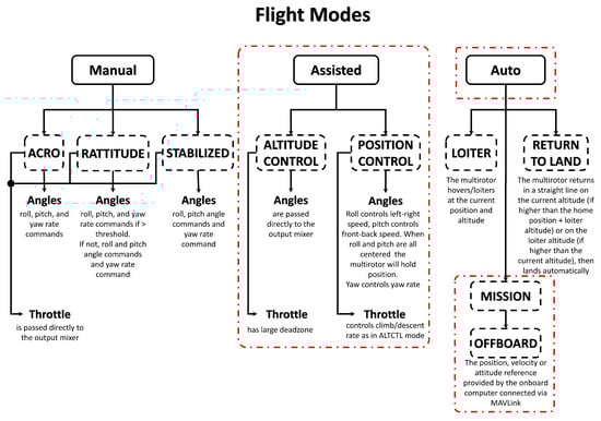 As it is illustrated in Figure 6, the flight controller (Pixhawk) has two controllers: A position and an attitude controller, that allow sweeping different level of controllability going from the Manual mode to the fully autonomous Auto mode.