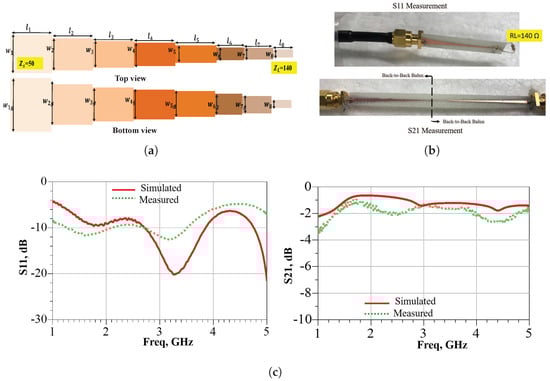 Fabricated balun layout and the measurement set-up for the performance characterization. (a) Photograph of the top and bottom view of the Balun layout; (b) Measurement set-up for and ; (c) Comparison between the measured and simulated data.