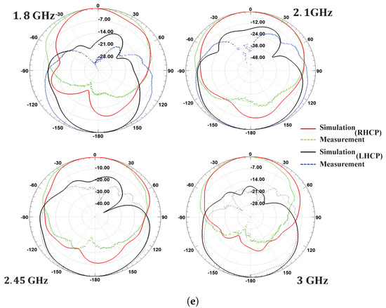 Figure 3c displays the simulated and measured axial ratio results of the antenna. It is noted that from 1.5 to 8.5 GHz, the antenna axial ratio is below 1 dB, and this implies that the cross-polarization ratio is below −30 dB. The gain versus frequency variation is illustrated in Figure 3d. It has an average value of 4.5 dBi with a maximum measured value of 5 dBi. The gain deteriorates at frequencies above 5 GHz owing to the mismatch with BALUN. Figure 3e shows the normalized radiation patterns of the antenna. Good right-handed circular polarization (RHCP) and left-handed circular polarization (LHCP) patterns with low cross polarization are obtained. The simulated and measured results are in good agreement. The radiation patterns are plotted at different in-band frequencies, namely, 1.8, 2.1, 2.45, and 3 GHz.