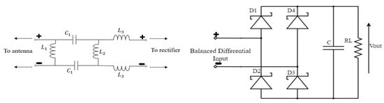 Many rectifier configurations have been proposed, for instance, diode in series [36], diode in shunt [37], diodes in bridge [38], and diodes in voltage doubler[39]. The most common rectifier structure used for energy harvesting applications is the voltage doubler. Although this topology offers twice the input voltage, it does not provide a balanced output voltage. Therefore, this architecture is modified to realize a DR as shown in Figure 5. The closed-form mathematical equation of the DR was accurately deduced and analyzed in [40]. This circuit is composed of four diodes (D1, D2, D3, and D4), and each pair is conducting during one half cycle of the input signal. While diodes D1 and D3 are conducting during the positive half cycle of the input signal, diodes D2 and D4 are conducting during the negative half cycle. The pumped voltage is stored in output capacitor C, with the load connected across it. The Skyworks SMS7630 Schottky diode is used, and the package parasitics are considered during the simulation. A parasitic inductance value of Lp = 1.15 nH and parasitic capacitance value of Cp = 0.25 pF provided by the manufacturer are added to the design schematic.